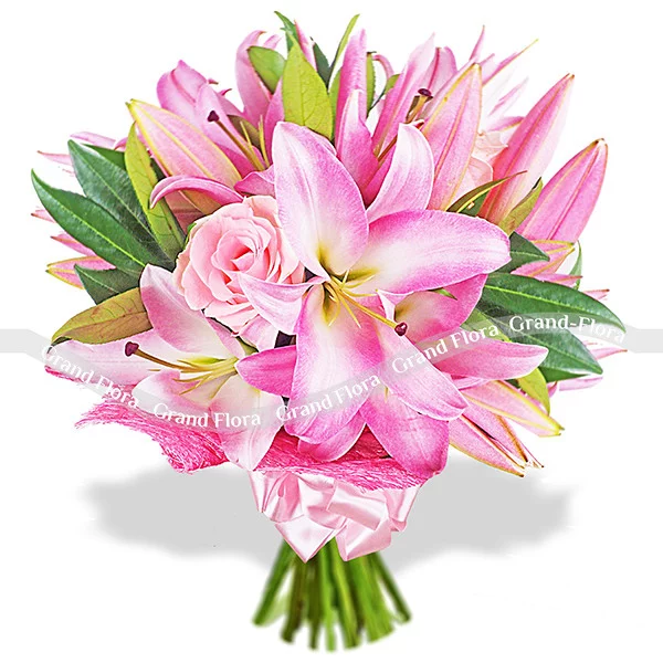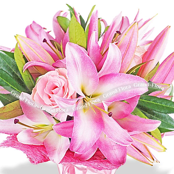 Стандартный (на фото): лилия розовая (возможна замена на белую) - 2 шт., роза розовая - 3 шт., натуральная упаковка - розовая.
