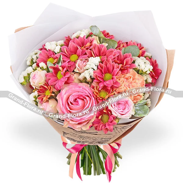 Стандартный: роза розовая - 2 шт., кустовая хризантема темно-розовая - 3 шт.,кустовая роза розовая - 2 шт., гвоздика персиковая - 2 шт., статица, эвкалипт, упаковка, лента. Примерный размер: 30Х30 см.