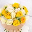 Букет выполнен из ярких желтых роз, и белых роз Ломоносов, с акцентами питтоспорума в стильном крафте и лентой нежного оттенка. Букет имеет высоту от 35 см, а диаметр букета зависит от выбранного Вами количества цветов. Обращаем Ваше внимание, что состав и оформление букета могут отличаться.