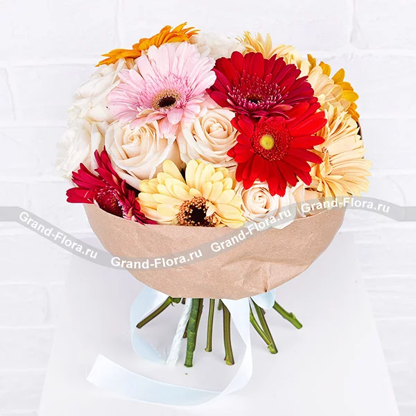 Пышная композиция, собравшая в себе милые герберы и очаровательные розы. На полотне букета, буйством красок собраны цвета, воплощающие и нежность, и игривость и романтику каждого дня.